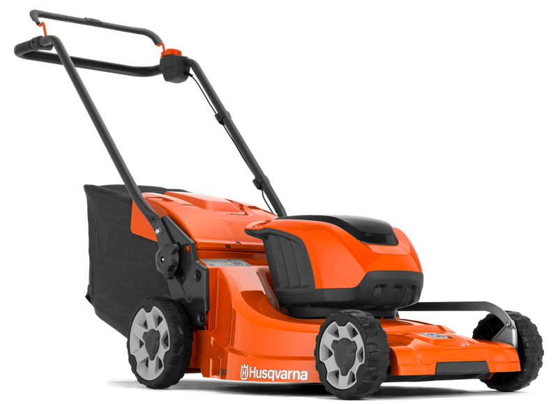 (Bare unit). Husqvarna LC 247i battery lawn mower has a large cutting width and double battery slots so that you can take care of medium-sized lawns easily and efficiently. Features the savE? mode for maximum run time when performing mowing that does not require full power, and PowerBoost to handle thicker grass efficiently. Adjustable handle, easy-to-reach bail, and quick and easy cutting height adjustment offer great ergonomics. The handle and collecting bag are foldable for better storage.
