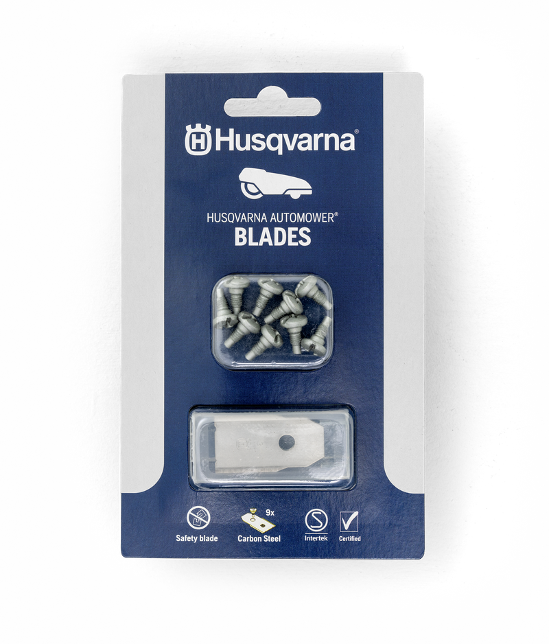 9 pcs Blade Set. Husqvarna Automower- Blades - hardened carbon steel blades, designed for safe handling and pivoting functionality. Safety blade according to standards.