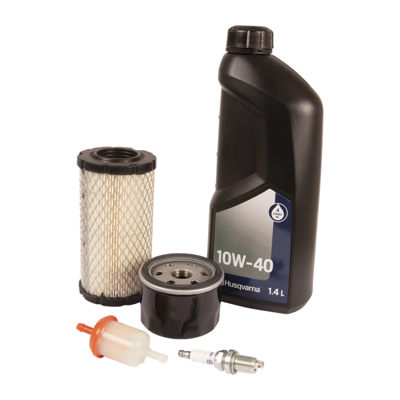 Maintenance Kit with air filter, fuel filter, oil filter, spark plug and motor oil - 100h. Husqvarna maintenance kit. Everything you need to maintain your equipment. Includes genuine Husqvarna parts that should be replaced at regular intervals for less downtime and more productivity..