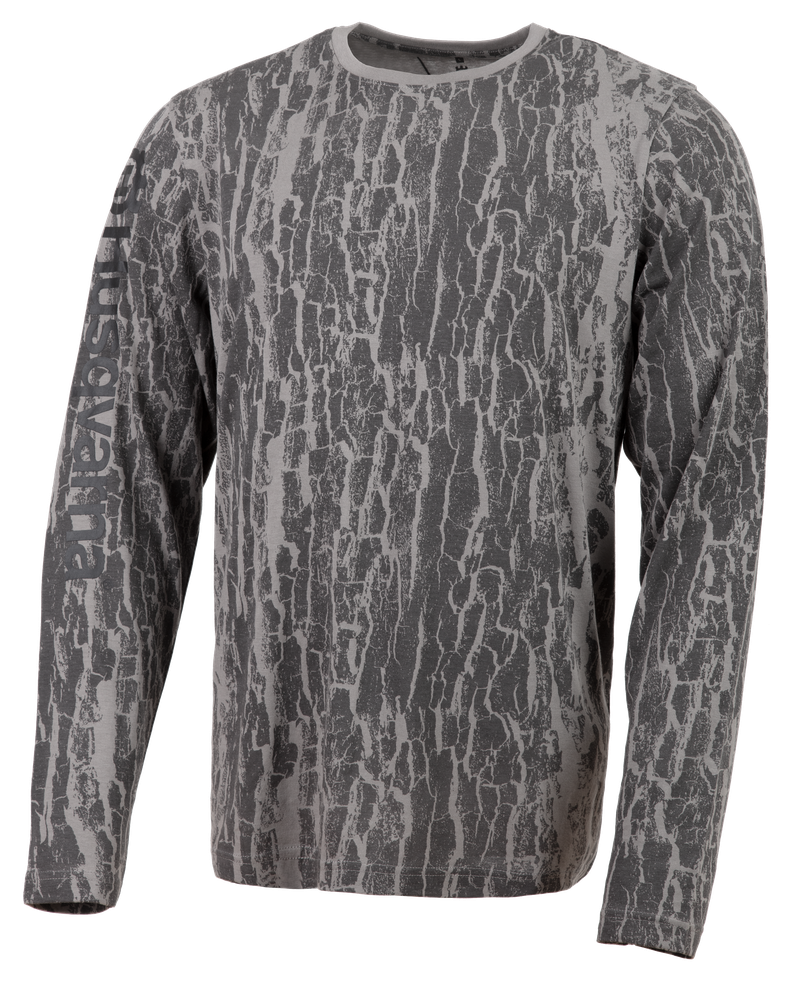 Unisex. Effortlessly combining style with sustainability, this long-sleeved t-shirt is a new addition to the Husqvarna Xplorer collection of leisure wear. Made from a blend of organic cotton, and polyester obtained from recycled plastic waste, this long-sleeved t-shirt is fast-drying and wear-resistant. It'll keep you cool and hold its colour and shape, also after repeated washes for a long lifespan. It comes in ebony grey and features a bark camo design. Unisex sizes XS-XXL.